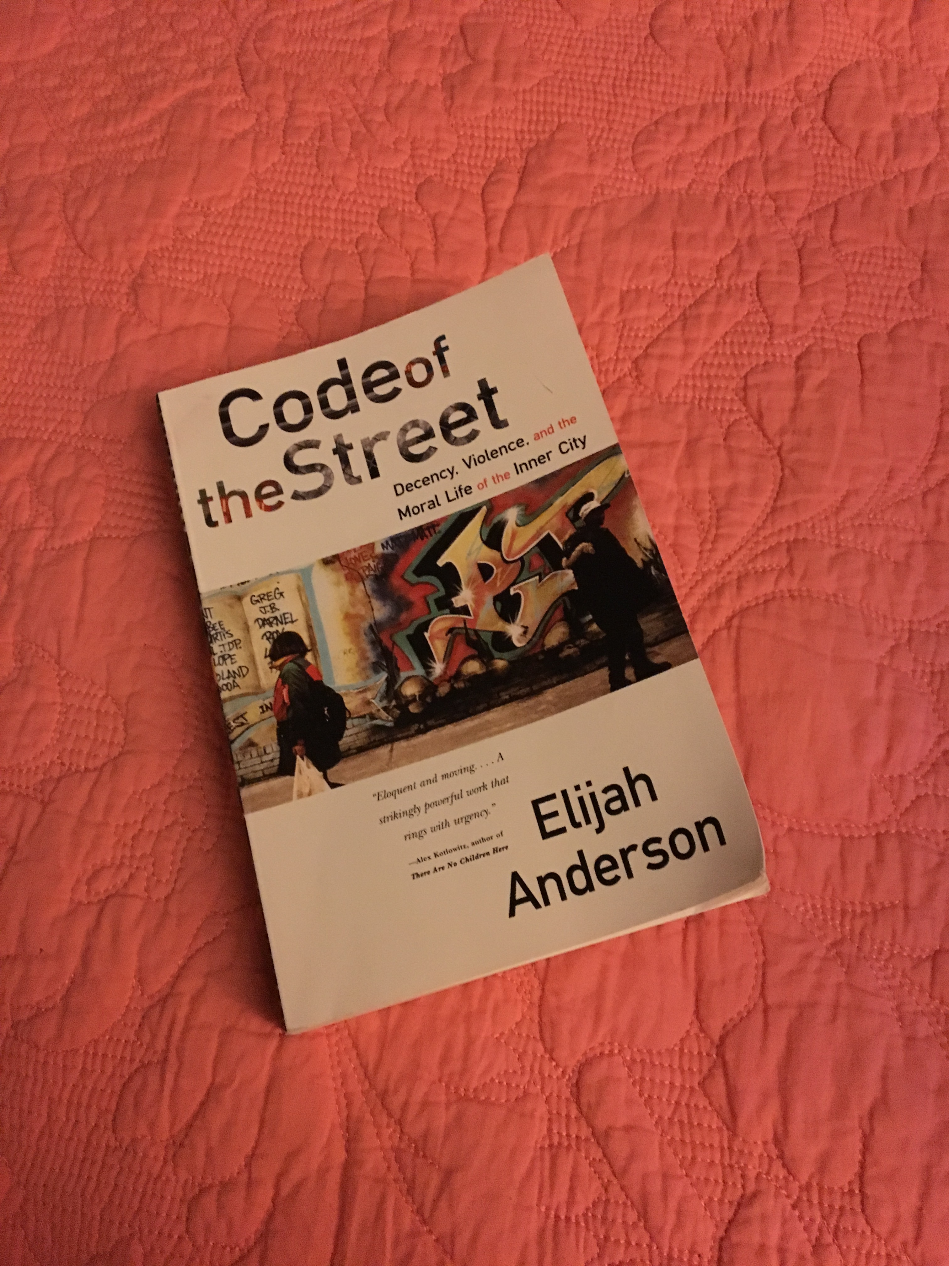 I am reading a book called “Code of the Street” by Elijah Anderson. There is a chapter that talks about ‘street’ people and ‘decent’ people. The author discusses the difference between the way in which each type of people responds to conflict. Typically street people respond with violence while decent people respond with talk, unless they have to use violence to protect themselves. I like to think of myself as ‘decent people’ and I prefer not to label this young man as ‘street people’, but his behavior puts him in that category. It’s quite possible that he is a ‘decent people’ who has learned that to earn respect on the streets you have to present yourself as being tough. Either way, RESPECT is a valuable commodity on the streets. Sometimes it’s all a person has to hold on to. To some it’s worth fighting for.